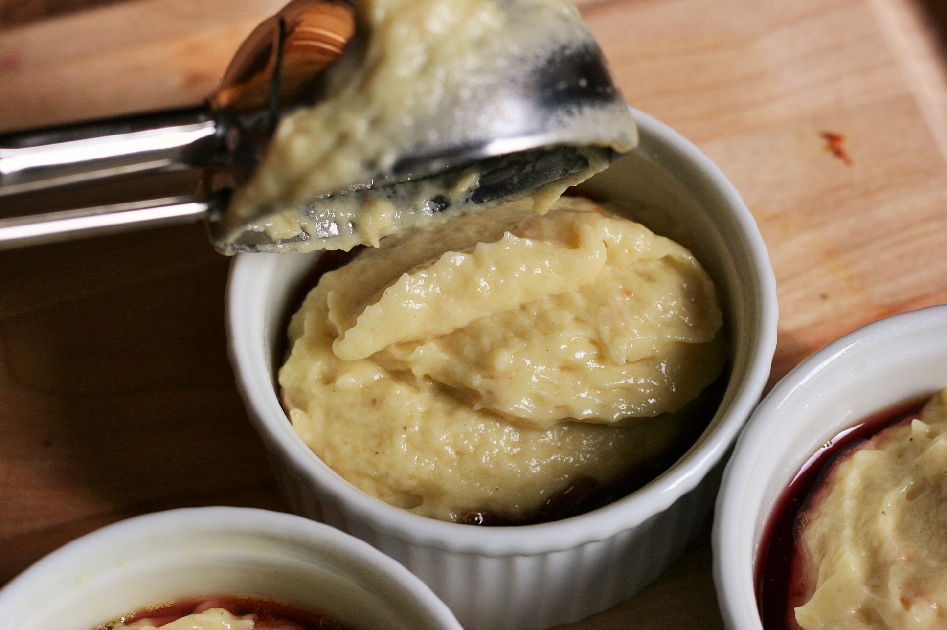 9. Scoop the batter about ⅔ of the way up the ramekins, or a 9 or 10 inch cake pan.
