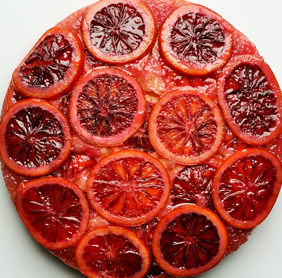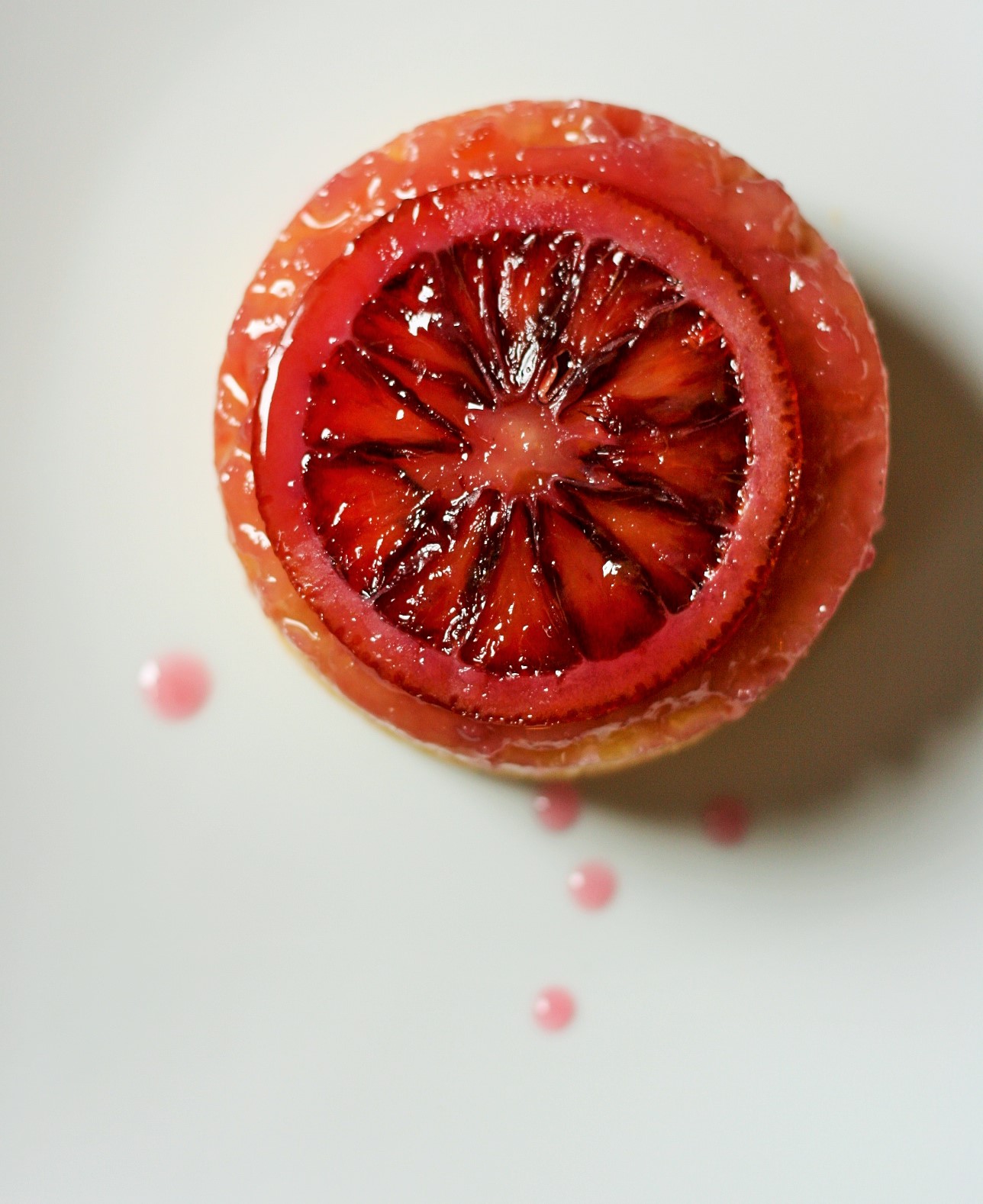 Simmering the orange slices on low heat. Candied Blood Orange Cake (3) The candied orange slices and syrup in the pan. Candied Blood Orange Cake (6) Orange slices in an individual ramekin. Candied Blood Orange Cake (5) The wet and dry ingredients. Candied Blood Orange Cake (1) Whisking the ingredients together. Candied Blood Orange Cake (2) Folding the dry ingredients into the wet ingredients. Candied Blood Orange Cake (7) Adding the blood orange zest. Candied Blood Orange Cake (8) Scooping the batter in the ramekins. Candied Blood Orange Cake (11) The baked ramekin cakelettes Candied Blood Orange Cake (13) A perfectly baked cakelette turned over onto a serving plate. Candied Blood Orange Cake (15) The cake version. Candied Blood Orange Cake (16) The candied blood oranges are heavenly in scent and delectable in taste. The slight hint of the olive oil, tang of the yogurt and exotic fragrance of the cardamom are intoxicating . Candied Blood Orange Cake (18)