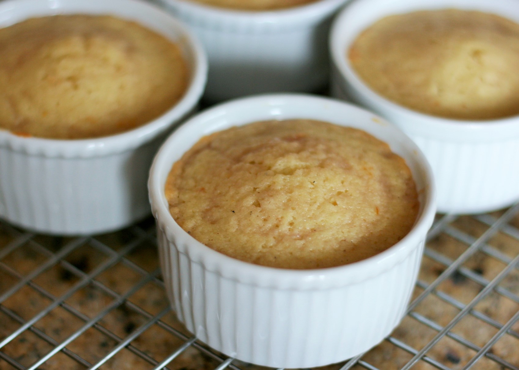 10. Bake the ramekin cakelettes for 25 minutes until just baked and a cake testing skewer or toothpick comes out clean or with a few crumbs. Remove from the oven and cool on a baking rack.