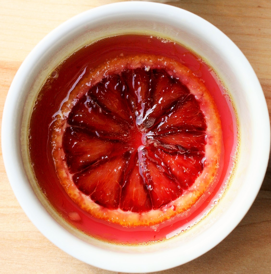 4. If using the ramekins, add a single slice of the candied blood orange and top with a tablespoon of the syrup.