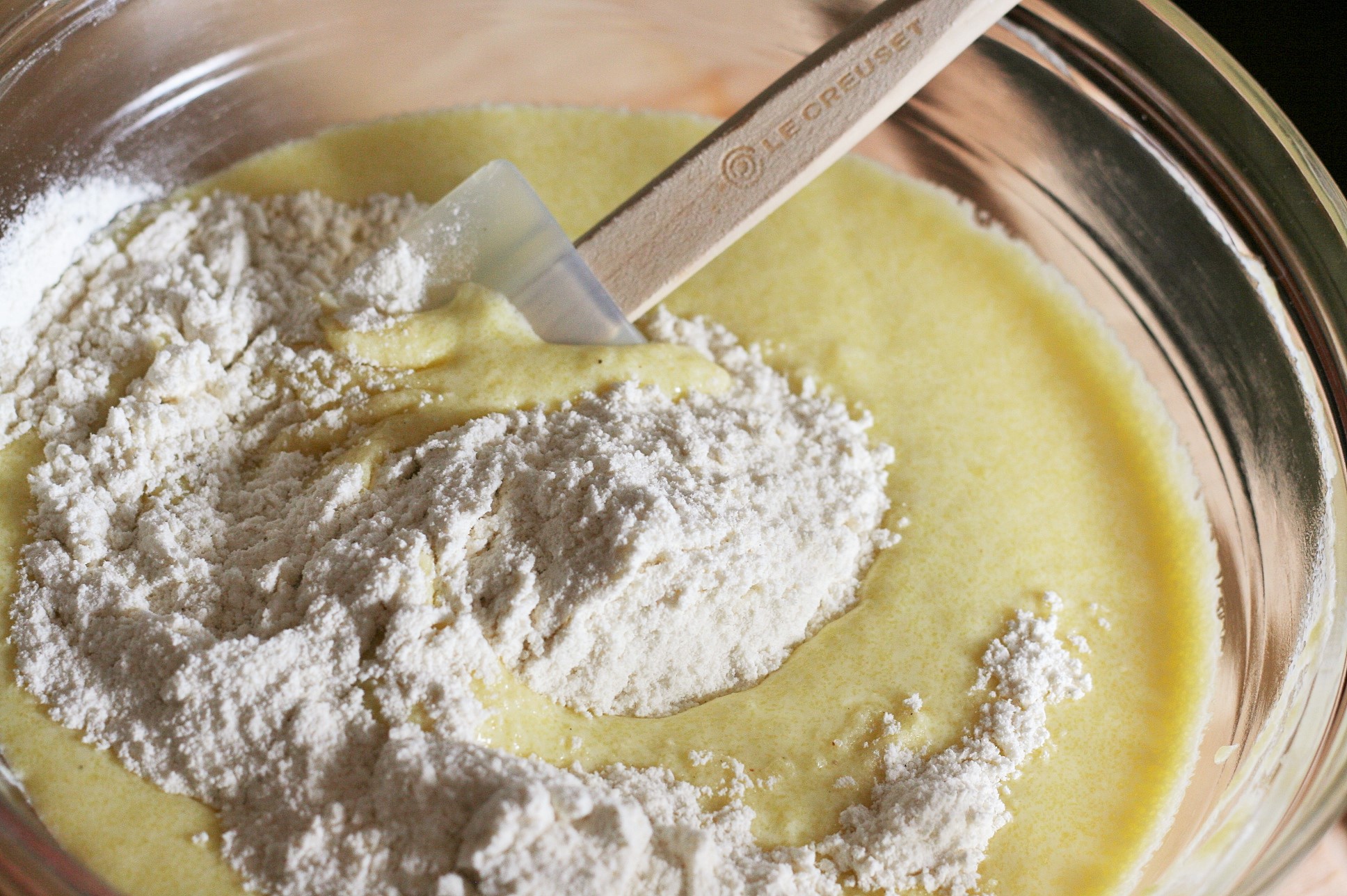 6. Whisk the dry ingredients, the flour, sugar, baking powder, salt and cardamom together until well combined. Whisk together the wet ingredients, the butter, olive oil, yogurt and eggs until combined into a homogeneous mixture, about 2 minutes.