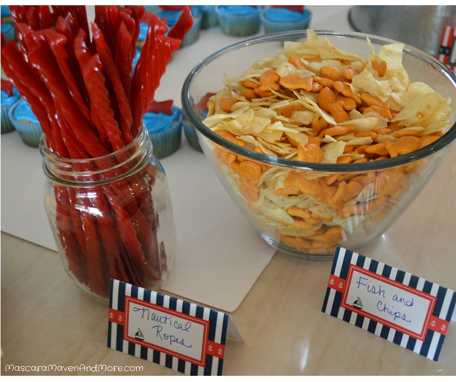 Here are some things I put together to celebrate my big man turning one with a nautical theme birthday party. You can apply these tricks to almost any theme. All you need to do is find creative ways to name food that fits your theme. For example, I bought Kool-Aid thinking it was blue. I was going to label it “Ocean Water.” Well, it came out red and turned into “Red Sea Water.” Also, when it comes to displaying things, just put them into a theme shape – like I did with his cupcakes. Another example, I cut a pepper into an octopus (or crab depending on who you asked) and stuck it in the veggie dip.
