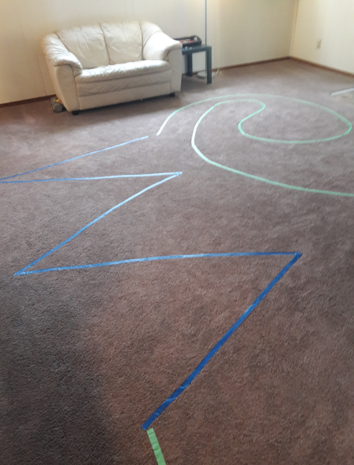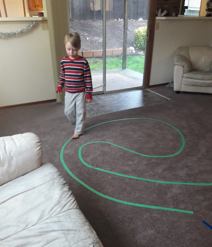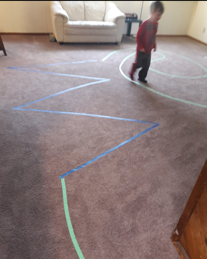 Below I have pictures of my recent course. I try to include lines to hop from, dots to tip toes, curves, zig zags, and lines to walk backwards. I ended with a star at the end to hop on and I think that was the biggest hit of all. The kids took turns seeing who could hop the highest/ hardest and so on. Once you have let the kids have fun just going through the course, you can mix it up and time them (I would recommend timing them against their own previous time, and not anyone else’s). Or changing the ‘rules’ by walking backwards when they normally walked forwards and such.