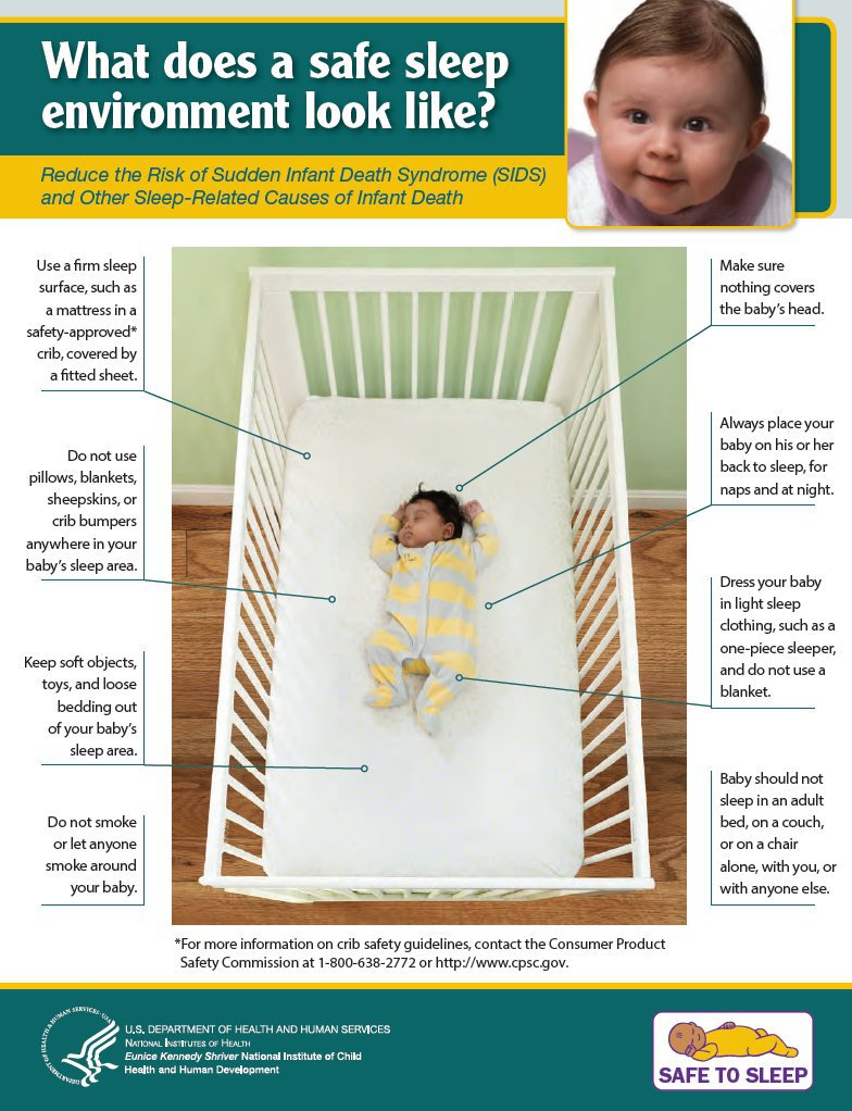 - Baby’s bed should be free and clear of bumpers, loose blankets, stuffed animals, and other objects.